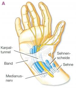 ziehend, Kribbeln, Taubheit; nicht immer in den frühen Morgenstunden zunehmend. Ggf. auch durch Computerarbeit oder Buchlesen auszulösen. Bei fortgeschrittener Nervenschädigung fällt es schwer, Sachen festzuhalten oder Flaschen zu öffnen (Lähmung des Daumenbeugers)