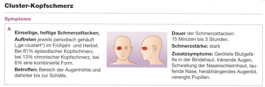 B: Starke oder sehr starke einseitig orbital, supraorbital und/oder temporal lokalisierte Schmerzattacken, die unbehandelt 15 bis 180 Minuten anhalten.