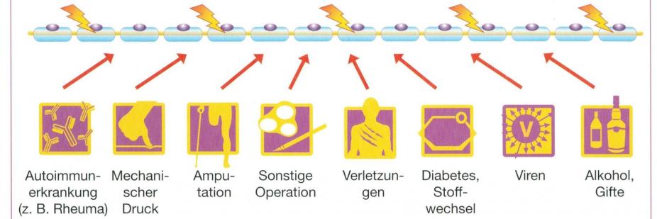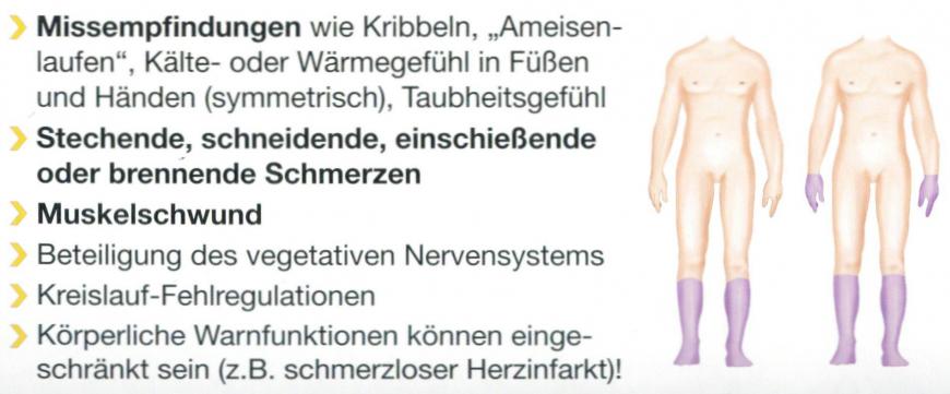 Eine Polyneuropathie ist eine Schädigung der kleinen Nerven, sozusagen die "Arthrose der Nerven". Als erstes wird die Isolierung der Nerven geschädigt, darum könne Impuls von z.B. Gefühlsfasern aus Schmerzfasern überspringen. Auch kommt es zu Funktionsstörungen der Nerven (Kabelbrüche, Wackelkontakte).