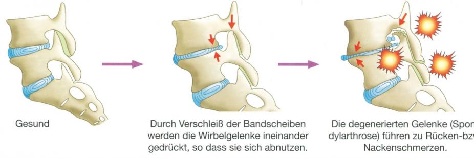 Die Spinalkanalstenose ist in den meisten Fällen Ausdruck einer degenerativen Erkrankung. Durch den Bandscheibenverschleiß kommt es zu einer minimalen Lockerung und Überbeweglichkeit der Wirbel. Bereits durch einen Wirbelversatz kann ein von 2 Wirbeln gebildeter Kanal verkleinert werden. Der Körper versucht der Lockerung entgegenzuwirken und vergrößert Bänder und Knochen (Gelenke). Auch dadurch wird der Nervenkanal eng. Besonders an der Halswirbelsäule versucht der Körper sogar Knochenbrücken, sog. Osteophyten, zu bilden, die Nervengewebe einengen.