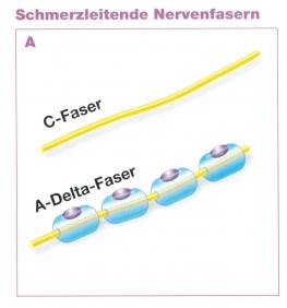 Sie kennen alle, dass wenn Sie sich das Schienbein gestoßen haben, ein scharfer, schneller Schmerz sofort zu spüren ist. Dieser wird über die schnellen A-delta Fasern geleitet.